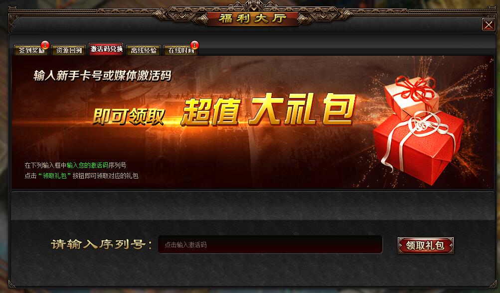 进入游戏点击右上角“福利大厅”选择“激活码”输入激活码,即可获得礼物邮件