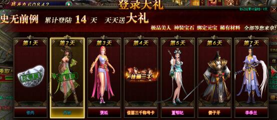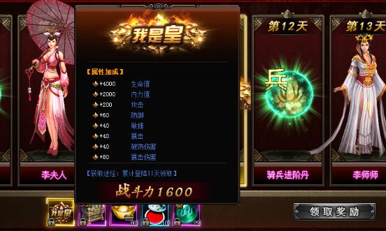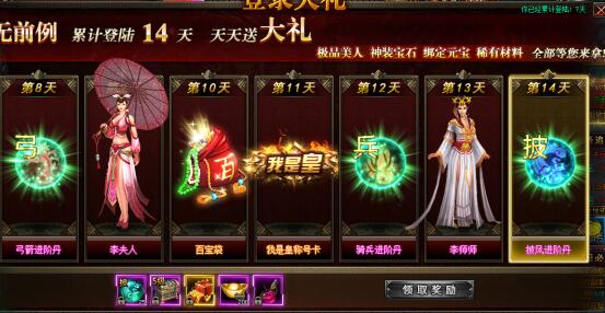 先看看第一天,除了10万银两还有2级宝石宝箱、培养石、一瓶攻击药水和5枚坐骑经验丹。再看傲天我是皇游戏中小编第七天的收获,除了美女李季兰,还可以收获200绑定元宝、五级宝石宝箱、8枚培养石以及25枚骑兵进阶丹。奖励不可谓不丰厚,这些都还是算最初的,越到后面奖励越多。不信我们打开第14天看一看就知道了。