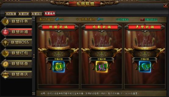 关于联盟祈福,傲天我是皇小编在之前的联盟介绍中就已经简单讲过。什么经验祈福、功勋祈福、声望祈福可以获得不同的奖励,可以选用贡献点也可以使用元宝,自己选择吧。